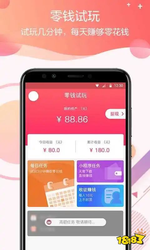 零钱试玩10元就能提取!一款手机试玩几分钟就能赚钱的APP.只要有一部手机,无需出门,无需投入,轻轻松松动手指,就能每天赚取奖励!还能通过收取徒弟,赚取徒弟同等的分成奖励哦.